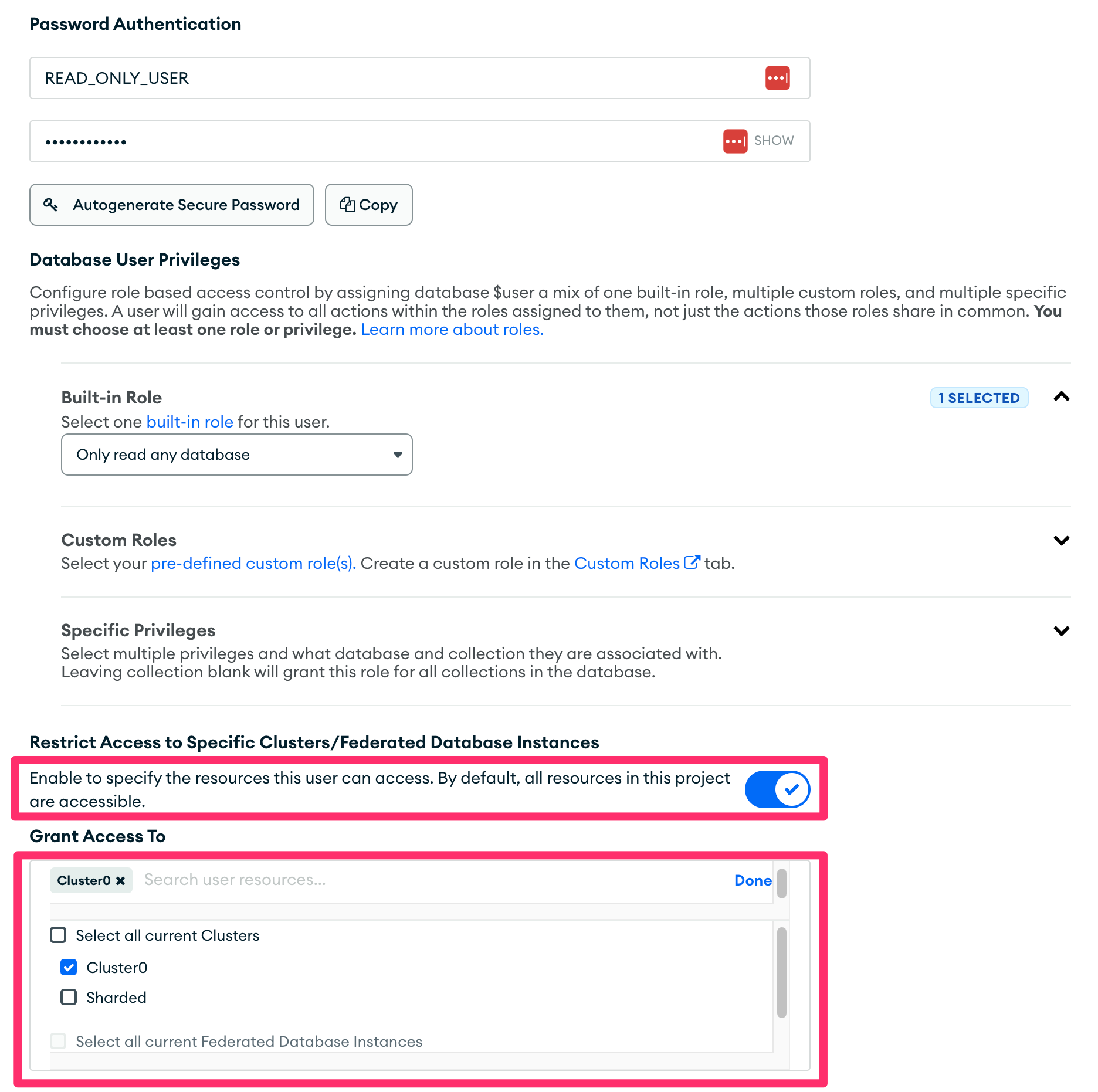 - Enable "Restrict Access to Specific Clusters/Federated Database instances" and enable only those clusters/database that you wish to replicate.